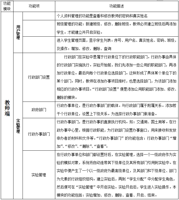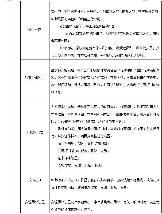 3、教師端:行(xing)政(zheng)(zheng)(zheng)部(bu)(bu)門(men)(men)設置、政(zheng)(zheng)(zheng)府部(bu)(bu)門(men)(men)、行(xing)政(zheng)(zheng)(zheng)辦事部(bu)(bu)門(men)(men)、實驗管理、學生(sheng)分配、行(xing)政(zheng)(zheng)(zheng)辦事項目、行(xing)政(zheng)(zheng)(zheng)項目庫、政(zheng)(zheng)(zheng)策法(fa)規(gui)、實驗得分設置、操作(zuo)結果(guo)統計、實驗操作(zuo)得分、實驗報告