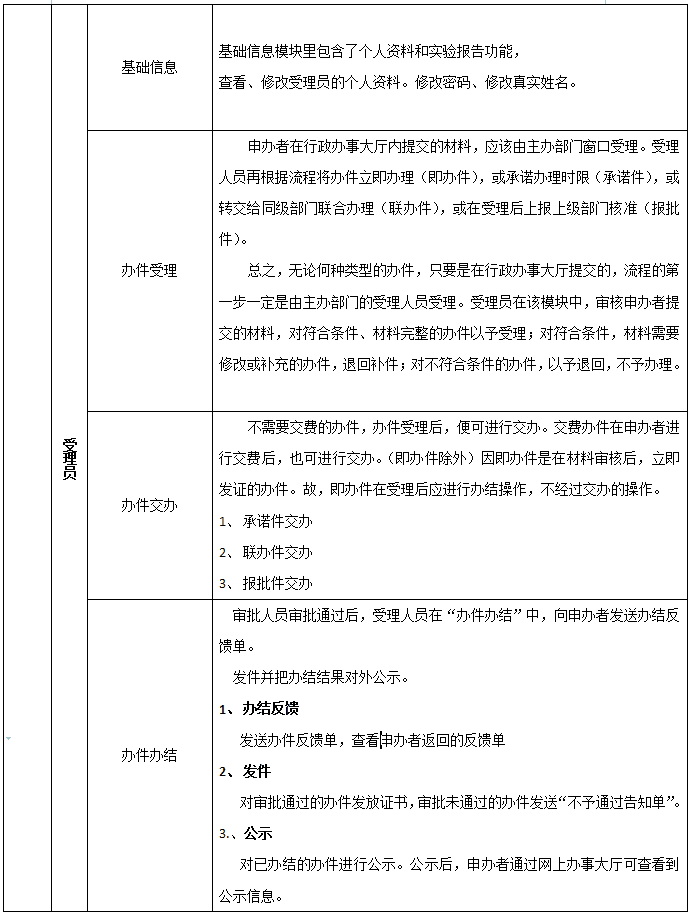 8、受理員(yuan):接(jie)受業務(wu)咨(zi)詢,受理業務(wu),具(ju)有(you)受理、退(tui)辦(ban)(ban)、補辦(ban)(ban)、交辦(ban)(ban)、轉(zhuan)辦(ban)(ban)等功能。辦(ban)(ban)件(jian)(jian)辦(ban)(ban)結(jie)后,還具(ju)備公(gong)示、發(fa)件(jian)(jian)、辦(ban)(ban)件(jian)(jian)統計的功能。同(tong)時(shi),受理員(yuan)還可以督辦(ban)(ban)、催辦(ban)(ban)、發(fa)布(bu)網上公(gong)告(gao)、政(zheng)務(wu)公(gong)開、政(zheng)策法規信(xin)息管理等。
