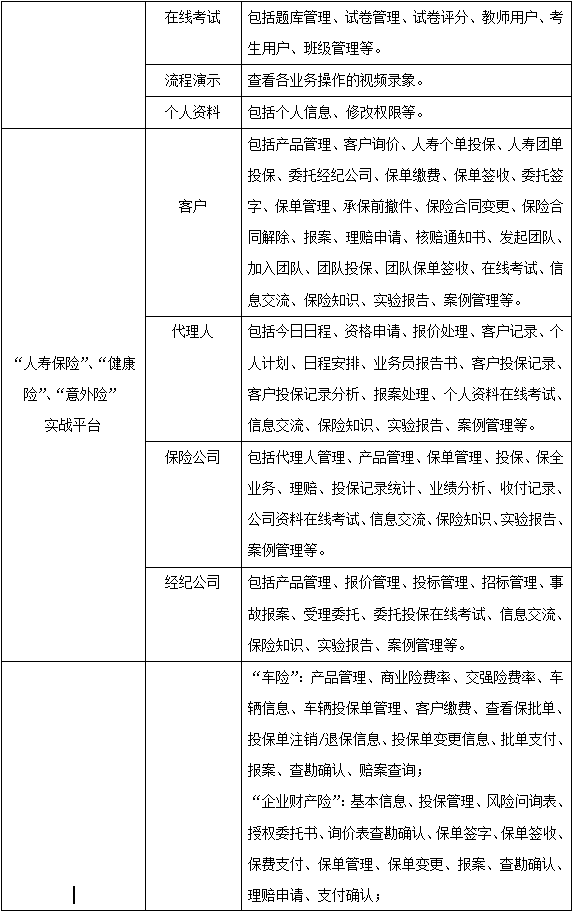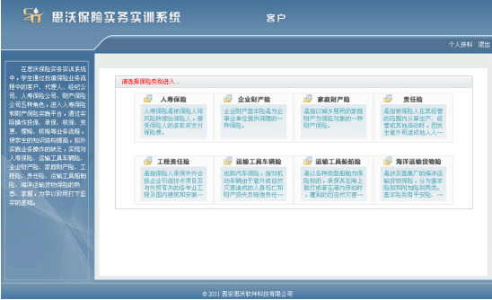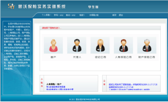 學(xue)生(sheng)(sheng)通過飾演(yan)保(bao)(bao)(bao)險(xian)業(ye)(ye)務(wu)流(liu)程(cheng)中的(de)客戶、代理(li)(li)人、經紀(ji)公司、人壽保(bao)(bao)(bao)險(xian)公司、財產保(bao)(bao)(bao)險(xian)公司五種角色,進(jin)入“人壽保(bao)(bao)(bao)險(xian)”和“財產保(bao)(bao)(bao)險(xian)”實(shi)踐(jian)平臺,從展業(ye)(ye)投保(bao)(bao)(bao)環節開始,至索賠理(li)(li)賠為(wei)(wei)止,全面操練保(bao)(bao)(bao)險(xian)核心業(ye)(ye)務(wu)中的(de)投保(bao)(bao)(bao)、承保(bao)(bao)(bao)、核保(bao)(bao)(bao)、變更(geng)、理(li)(li)賠、核賠等流(liu)程(cheng),使學(xue)生(sheng)(sheng)的(de)知識結構提升,彌補(bu)實(shi)踐(jian)業(ye)(ye)務(wu)操作的(de)缺(que)乏,實(shi)現對(dui)人壽保(bao)(bao)(bao)險(xian)、運輸工具(ju)(ju)車輛險(xian)、企業(ye)(ye)財產險(xian)、家庭財產險(xian)、海洋運輸貨物保(bao)(bao)(bao)險(xian)、運輸工具(ju)(ju)船舶(bo)險(xian)、責任險(xian)、工程(cheng)險(xian)的(de)熟悉(xi)、掌(zhang)握,對(dui)保(bao)(bao)(bao)險(xian)業(ye)(ye)務(wu)的(de)主(zhu)要工作流(liu)程(cheng)有一個清晰的(de)輪(lun)廓,為(wei)(wei)學(xue)以致用打(da)下堅固的(de)基(ji)礎(chu)。