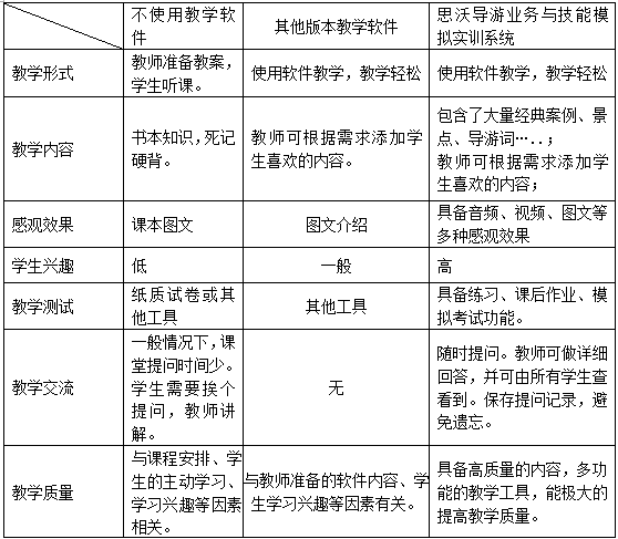在本教(jiao)學軟件中(zhong)(zhong),囊括(kuo)了幾乎所有(you)(you)導游(you)所需要的(de)(de)各種(zhong)信(xin)息,這種(zhong)信(xin)息量(liang)可(ke)(ke)以(yi)說是(shi)海納百川(chuan),是(shi)一個龐大(da)的(de)(de)數(shu)據庫(ku)。學校使(shi)用這個數(shu)據庫(ku)不(bu)但可(ke)(ke)以(yi)提(ti)供為(wei)教(jiao)師上課使(shi)用,還可(ke)(ke)以(yi)成(cheng)為(wei)學生(sheng)的(de)(de)電子閱覽(lan)書庫(ku),例如(ru)在“景(jing)點(dian)視頻(pin)”模塊中(zhong)(zhong)有(you)(you)包(bao)含國內外大(da)量(liang)著(zhu)名景(jing)點(dian)的(de)(de)視頻(pin)介紹(shao),生(sheng)動有(you)(you)趣。其中(zhong)(zhong)許多內容,包(bao)括(kuo)天(tian)文地理、人文經(jing)濟、法律法規、禮(li)儀儀態等,將不(bu)單(dan)單(dan)滿足旅(lv)游(you)專業的(de)(de)學生(sheng),還可(ke)(ke)以(yi)提(ti)供給(gei)非旅(lv)游(you)專業的(de)(de)學生(sheng)大(da)量(liang)、豐富的(de)(de)文化知識(shi)。