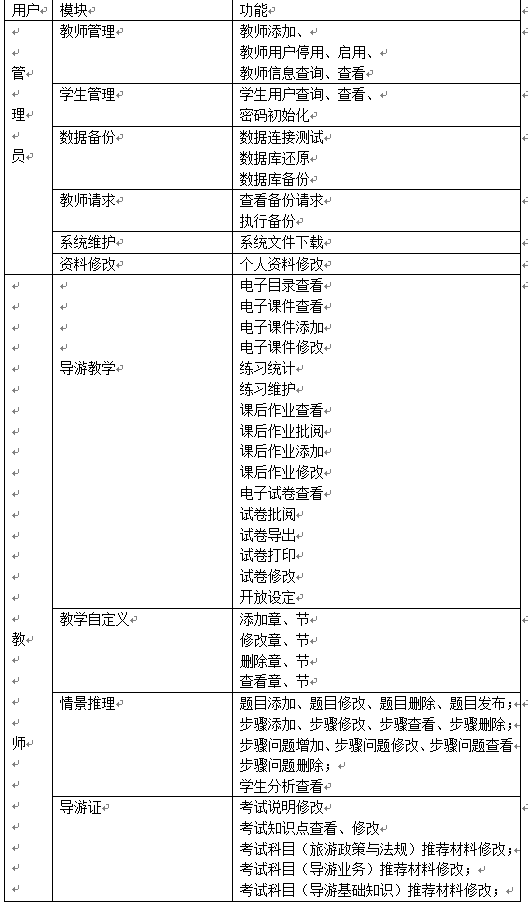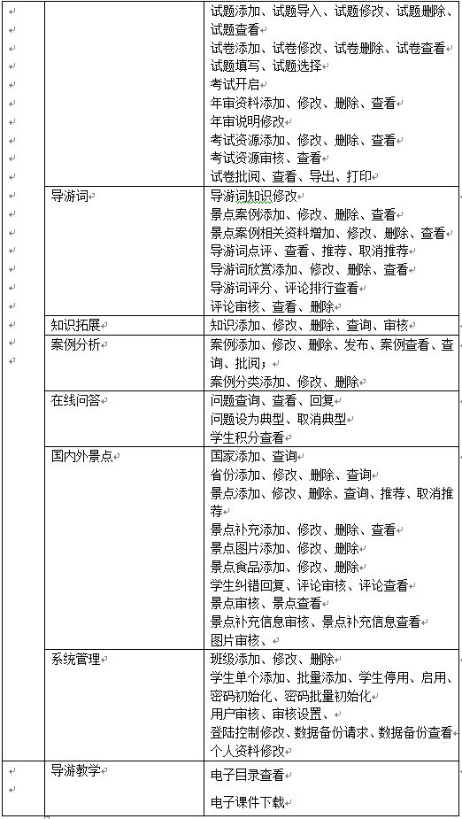 教師主要功(gong)能(neng)包括班(ban)級學生管(guan)(guan)理(li)(li)、導(dao)(dao)游基(ji)礎知(zhi)(zhi)(zhi)識(shi)管(guan)(guan)理(li)(li)、國(guo)內(nei)導(dao)(dao)游知(zhi)(zhi)(zhi)識(shi)管(guan)(guan)理(li)(li)、國(guo)外導(dao)(dao)游知(zhi)(zhi)(zhi)識(shi)管(guan)(guan)理(li)(li)、情景(jing)題目管(guan)(guan)理(li)(li)、導(dao)(dao)游證考試資料管(guan)(guan)理(li)(li)、模擬考試、導(dao)(dao)游詞管(guan)(guan)理(li)(li)、導(dao)(dao)游案(an)例(li)(li)管(guan)(guan)理(li)(li)、知(zhi)(zhi)(zhi)識(shi)拓(tuo)展、案(an)例(li)(li)分析管(guan)(guan)理(li)(li)、在線(xian)問答、國(guo)內(nei)外景(jing)點信息(xi)管(guan)(guan)理(li)(li)等。