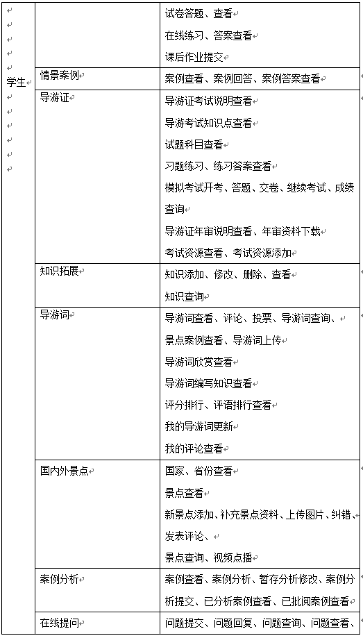 學(xue)生(sheng)的(de)(de)(de)主要功能是導(dao)(dao)游(you)(you)教學(xue)知識的(de)(de)(de)學(xue)習(xi)、完成情景(jing)推理中包含的(de)(de)(de)案例及題目、導(dao)(dao)游(you)(you)證考試(shi)學(xue)習(xi)及模擬考試(shi)、導(dao)(dao)游(you)(you)拓展知識學(xue)習(xi),同時可添加新的(de)(de)(de)知識供其(qi)他同學(xue)學(xue)習(xi)、導(dao)(dao)游(you)(you)詞學(xue)習(xi)并編寫(xie)導(dao)(dao)游(you)(you)詞、國內外景(jing)點學(xue)習(xi)、案例分析(xi)和在線提問。