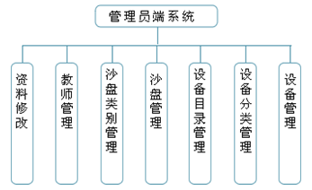 管(guan)(guan)理(li)(li)(li)員端系(xi)統主(zhu)要(yao)由資料修改、教師管(guan)(guan)理(li)(li)(li)、沙盤類別(bie)管(guan)(guan)理(li)(li)(li)、沙盤管(guan)(guan)理(li)(li)(li)、設(she)備(bei)目錄管(guan)(guan)理(li)(li)(li)、設(she)備(bei)分(fen)類管(guan)(guan)理(li)(li)(li)、設(she)備(bei)管(guan)(guan)理(li)(li)(li)等幾大模(mo)塊組成。