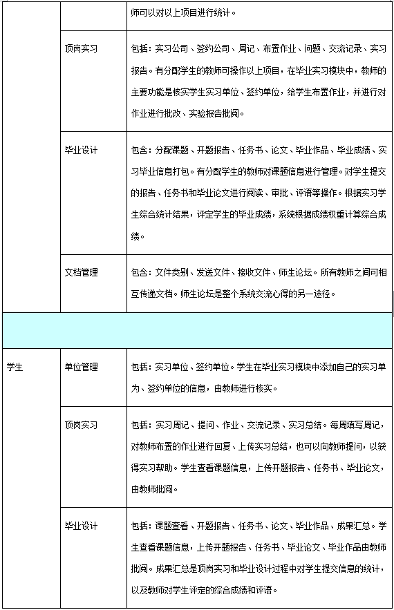 便(bian)于(yu)教師的優(you)質資源共享(xiang),加(jia)深(shen)教師之間合作。學(xue)生(sheng)(sheng)的問題(ti)及(ji)時(shi)得(de)以解(jie)決,分享(xiang)經驗(yan),探(tan)討得(de)失。學(xue)生(sheng)(sheng)可以提交實(shi)習(xi)單位的工作介(jie)紹(shao)以及(ji)簽約單位,供教師查閱。