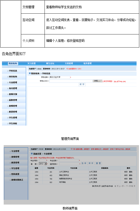 軟件按(an)管(guan)(guan)(guan)理(li)員、教師(shi)、學生(sheng)(sheng)(sheng)分為三種用戶權限(xian)。其中,管(guan)(guan)(guan)理(li)員設置(zhi)軟件基礎信息,包(bao)(bao)括:學校(xiao)信息、院校(xiao)組織機(ji)構、屆數年份管(guan)(guan)(guan)理(li)、教師(shi)類別、權限(xian)管(guan)(guan)(guan)理(li)等。教師(shi)根(gen)據權限(xian)不(bu)同,功能模(mo)塊不(bu)同,只有(you)開通了權限(xian)的(de)教師(shi)可操作(zuo)(zuo)相應(ying)的(de)功能。教師(shi)角色的(de)主要模(mo)塊包(bao)(bao)括:系統(tong)設置(zhi)、統(tong)計(ji)查看、畢(bi)業實(shi)習、畢(bi)業設計(ji)、成(cheng)績管(guan)(guan)(guan)理(li)、輔助(zhu)工具(ju)。學生(sheng)(sheng)(sheng)在實(shi)習期間,應(ying)按(an)時(shi)填寫(xie)周記(ji),完成(cheng)教師(shi)的(de)作(zuo)(zuo)業,在有(you)疑問(wen)時(shi)還可以向教師(shi)提問(wen)。學生(sheng)(sheng)(sheng)端的(de)主要模(mo)塊有(you):畢(bi)業實(shi)習匯總、畢(bi)業實(shi)習、畢(bi)業設計(ji)、成(cheng)績查看、輔助(zhu)工具(ju)